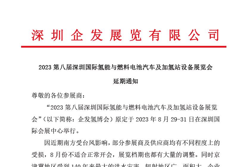 2023第八屆深圳國際氫能與燃料電池汽車及加氫站設備展覽會延期通知