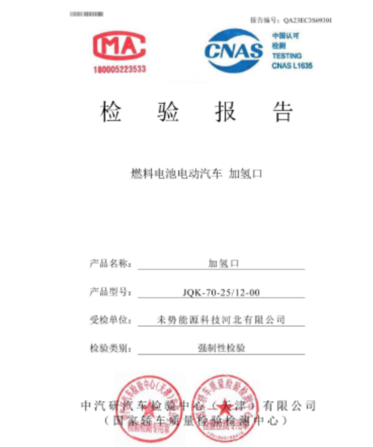 未勢能源三款加氫口順利通過國家強檢認證