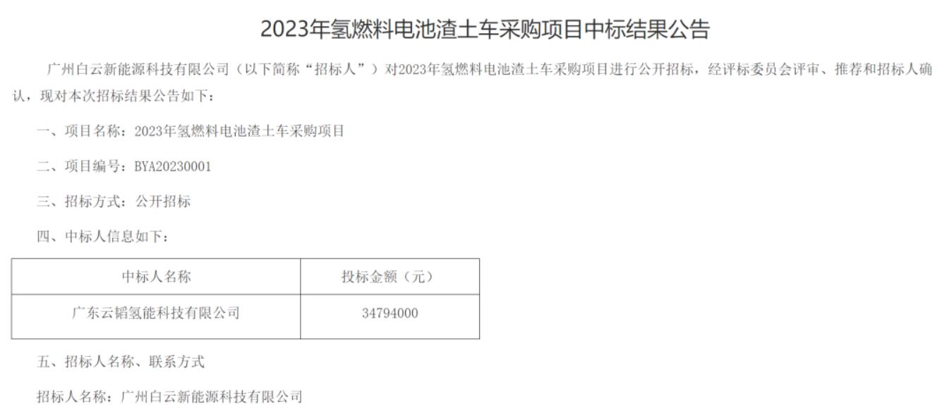 云韜氫能中標(biāo)廣州白云新能源科技有限公司燃料電池渣土車項目