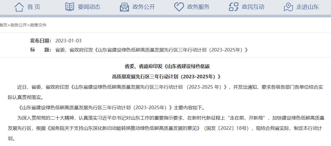 1月3日,山東省委、省政府印發《山東省建設綠色低碳高質量發展先行區三年行動計劃 (2023-2025 年)》