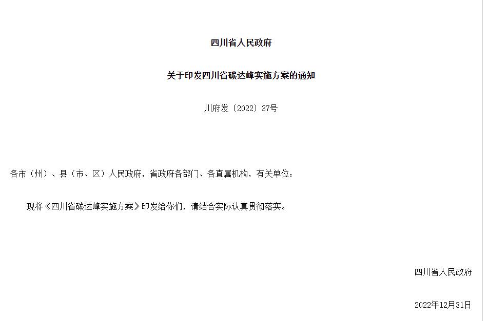 氫啟未來網獲悉,1月5日,四川省人民政府印發《四川省碳達峰實施方案》