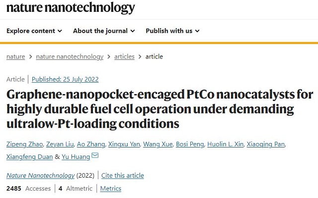 近日,Nature Nanotechnology上發表了一篇題為“Graphene-nanopocket-encaged PtCo nanocatalysts for highly durable fuel cell operation under demanding ultralow-Pt-loading conditions”的研究成果。該工作主要由北京理工大學趙紫鵬教授、加州大學洛杉磯分校(UCLA)黃昱教授等研究人員共同完成。