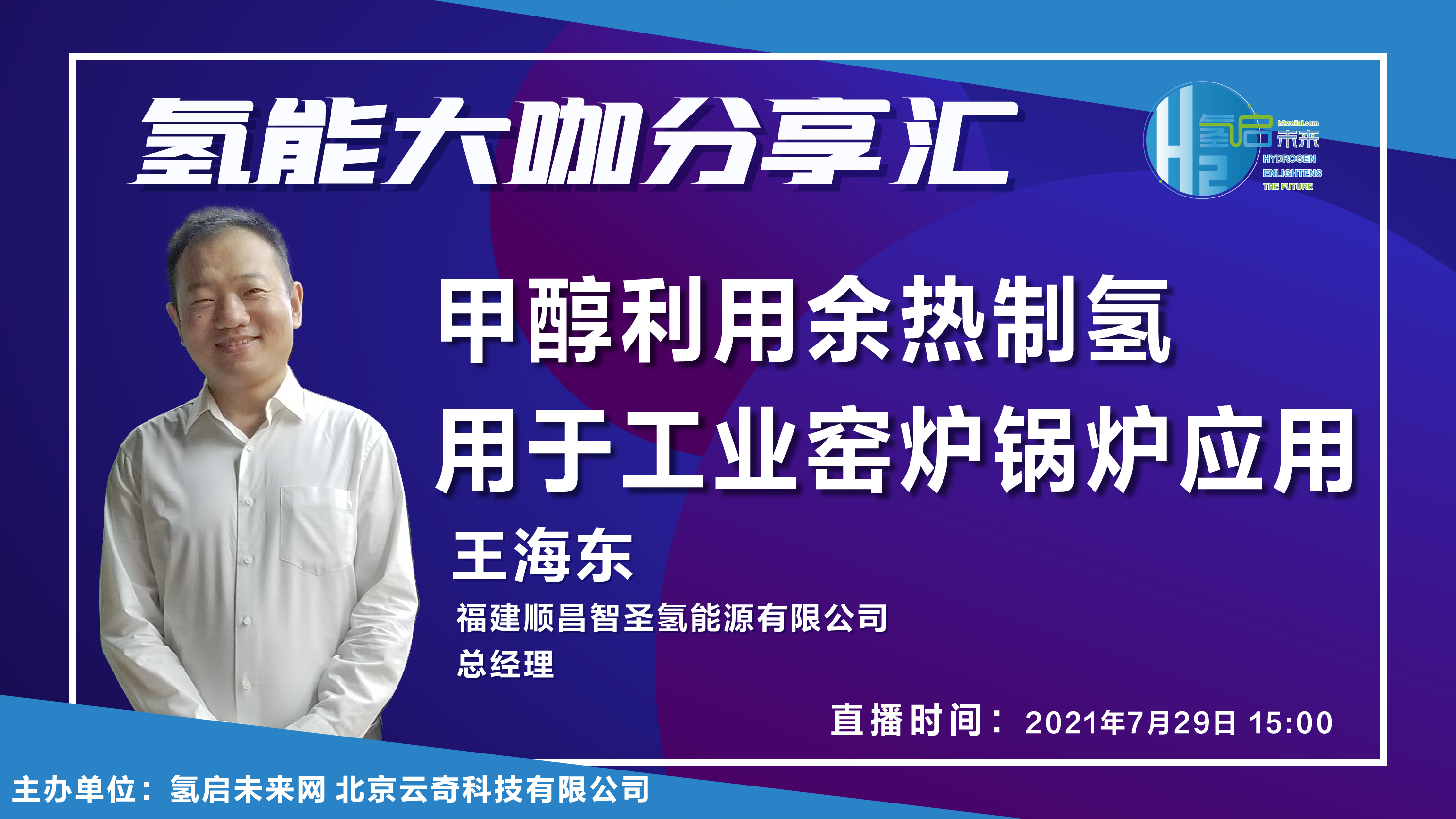 7月29日,下午三時(每周四下午三時直播),由氫啟未來網和北京云奇科技有限公司主辦的氫能大咖分享匯——第15期準時開播,本次分享匯邀請到的大咖是福建順昌智圣氫能源有限公司總經理王海東,他作了主題為“甲醇利用余熱制氫用于工業窯爐鍋爐”的演講。
