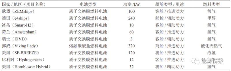 歐盟、德國、美國、挪威、日本等先進國家和地區在船用氫燃料電池推進技術領域處于領先地位,已實現船用氫燃料電池動力推進裝置的示范及應用,進入推廣應用階段。國外主要船用燃料電池推進技術示范項目如表 1 所示。