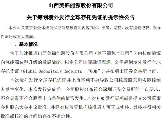 [ 導讀 ]10月21日,美錦能源發布《關于籌劃境外發行全球存托憑證的提示性公告》