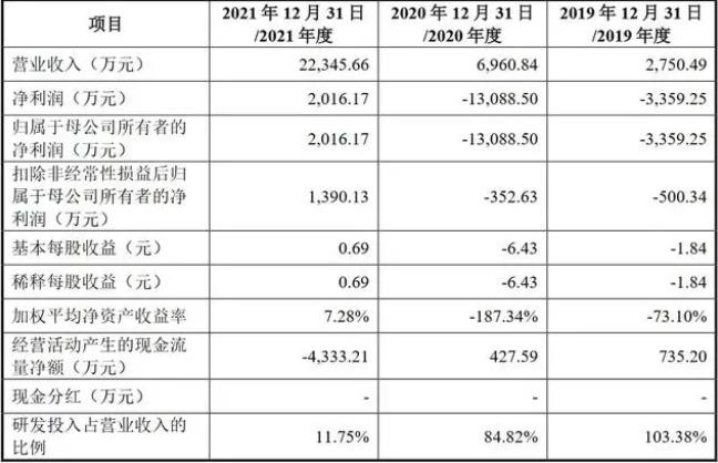 財務方面,于2019年度、2020年度、2021年度,公司實現營業收入約為2750.49萬元、6960.84萬元、2.23億元。凈利潤分別約為-3359.25萬元、-1.31億元、-2016.17萬元。