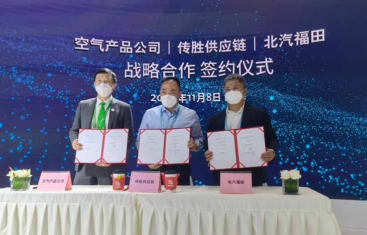 11月8日,風頭正勁的氫燃料電池車領域在進博會上迎來一樁喜訊,在空氣產品公司展臺,傳勝供應鏈管理(上海)有限公司(以下簡稱“傳勝供應”)、北汽福田汽車股份有限公司(以下簡稱“福田汽車”)、空氣化工產品(中國)投資有限公司(以下簡稱“空氣化工產品投資”)三方,分別作為甲乙丙方,簽署了戰略合作協議。
