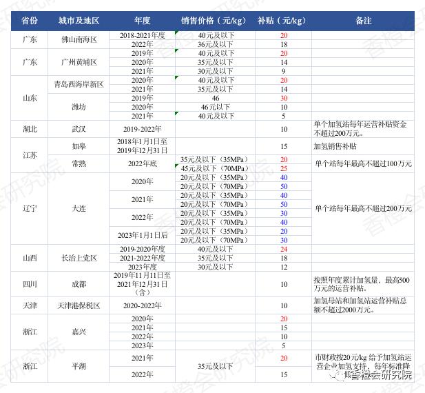 加氫補(bǔ)貼方面,目前已有濰坊、武漢、成都、嘉興、大連、如皋、常熟、平湖、佛山南海區(qū)、廣州黃埔區(qū)、青島西海岸新區(qū)、天津港保稅區(qū)、長(zhǎng)治上黨區(qū)等13個(gè)地方明確加氫運(yùn)營(yíng)補(bǔ)貼,但尚未有省級(jí)文件出臺(tái)。