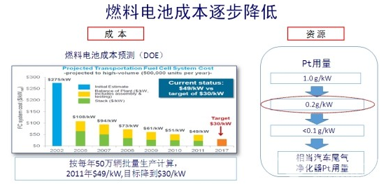 從成本來看,目前如果按年產(chǎn)50萬輛計,燃料電池每千瓦成本大約是49美元,這個價格是可以接受的。業(yè)內(nèi)有種看法是燃料電池汽車受鉑(Pt)資源的限制,現(xiàn)在氫燃料電池鉑用量國際先進水平能做到0.2g/kW,國內(nèi)目前水平是0.4g/kW左右,產(chǎn)業(yè)化的需求是要降低到小于0.1g/kW。小于0.1g/kW是什么概念?據(jù)衣寶廉院士介紹,就是跟汽車尾氣凈化器用的貴金屬量相當,這是需要依靠技術(shù)進步逐步實現(xiàn)的。