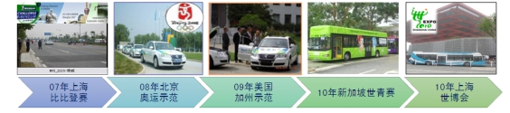 2008年北京奧運會23輛車,其中3輛大巴,20輛轎車。2009年有16輛車到美國加州進行了試驗。2010年上海世博會,一共是196輛燃料電池車參加了運營。燃料電池功率是50kW,鋰電池的功率是20kW,此外,還參加了新加坡的世青賽。北京奧運會用的公交車在北京801路上進行了示范運行,燃料電池的功率是80kW。