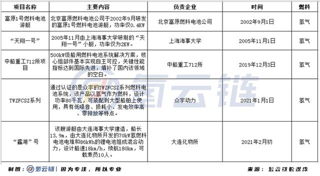 據(jù)氫云鏈數(shù)據(jù)庫(kù)統(tǒng)計(jì),國(guó)內(nèi)的燃料電池船舶研究起步較晚,二十年僅有5個(gè)可參考的案例。直至近期,國(guó)內(nèi)燃料電池船舶在動(dòng)力系統(tǒng)認(rèn)證和整船方面同時(shí)發(fā)展迎來(lái)實(shí)質(zhì)性的突破。