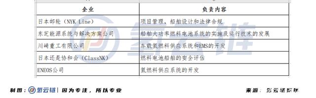 以日本游輪NYK Line項(xiàng)目為例,NYK Line將管理整個(gè)項(xiàng)目,同時(shí)協(xié)助船舶設(shè)計(jì)和法律合規(guī);東芝將在船上安裝大功率燃料電池系統(tǒng)并開發(fā)操作技術(shù);川崎重工將負(fù)責(zé)開發(fā)船上的氫氣供應(yīng)系統(tǒng)和能源管理系統(tǒng);Eneos負(fù)責(zé)開發(fā)氫燃料供應(yīng)體系(該公司的前身為JXTG);日本船級(jí)社ClassNK將合作對(duì)已開發(fā)船只的安全性進(jìn)行評(píng)估。