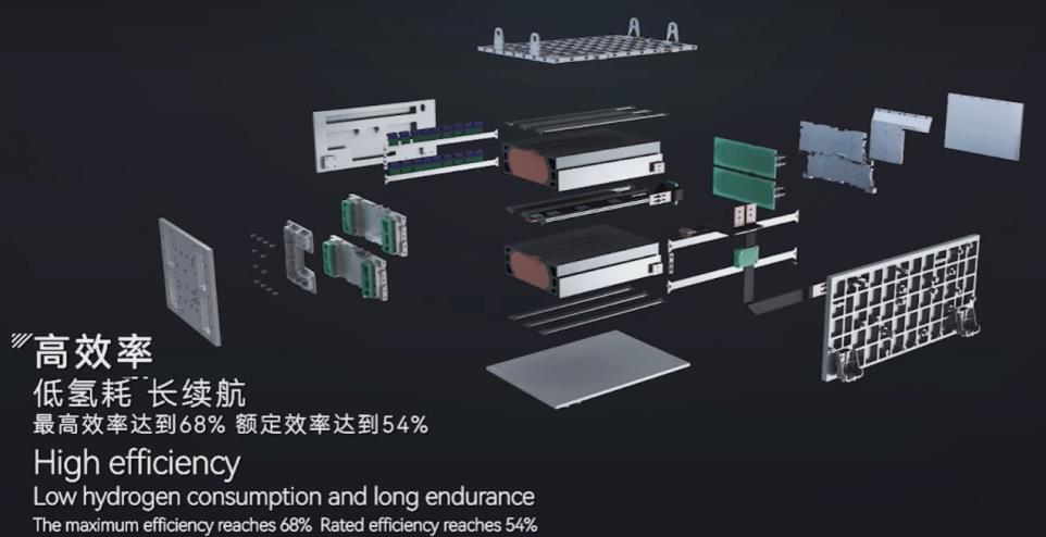 300+KW膨脹石墨板電堆,極板、膜電極、密封、節電壓檢測模塊、端板等關鍵零部件均已實現100%國產化,具有高效率、高功率、長壽命、高可靠性、高適配性等優勢,最高效率達到68%,峰值功率密度達到4.0KW/L,柔性石墨板單板厚度0.65mm,雙極板的厚度1.3mm,設計壽命3萬小時,綜合性能指標達到國際先進水平,可以靈活匹配商用車、船舶及鐵路車輛等場景。
